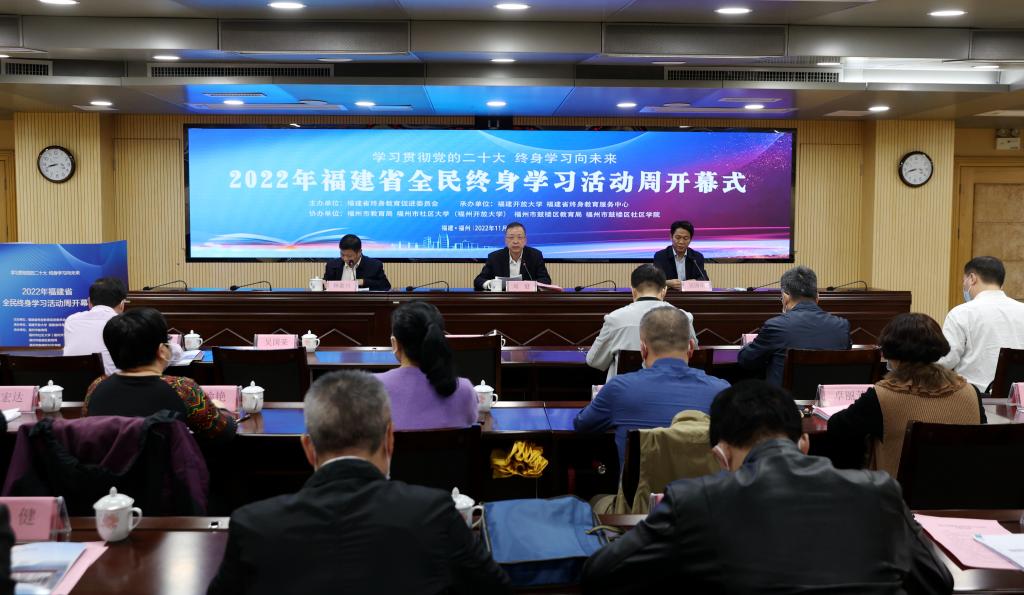 11月30日,2022年福建省全民终身学习活动周在福州开幕,今年活动周的主题是“学习贯彻党的二十大,终身学习向未来”。省委教育工委委员、省教育厅党组成员、副厅长(正厅长级)刘健,福建开放大学党委副书记、校长吴国荣,副校长沈光辉出席开幕式,省教育厅职业教育与成人教育处处长、一级调研员林素川主持。