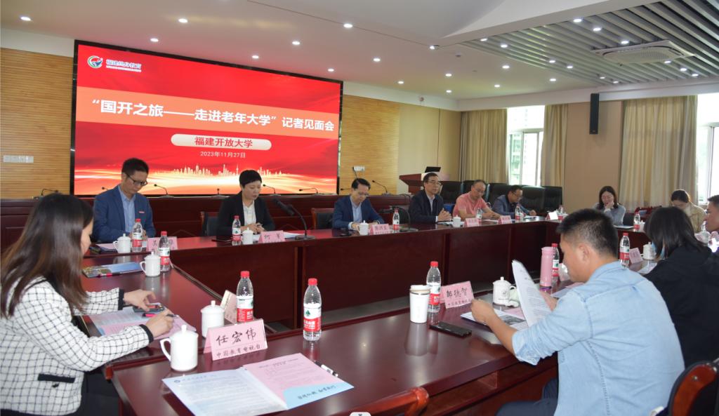 11月27日-29日,人民日报、新华网、光明日报、中国新闻社、中国青年报、农民日报、中国教育电视台、人民网、中国网、人民政协网、中国老年报等多家媒体组成的记者团走进福建。记者团首站来到我校,对我校老年教育的开展情况、经验做法、特色亮点等内容进行实地采访。校党委书记陈兴炎、副校长沈光辉,国家开放大学宣传统战部部长何菁、国家开放大学宣传部、老年学院和学校宣传部、终身教育服务中心、资源办等相关人员出席了记者见面会。